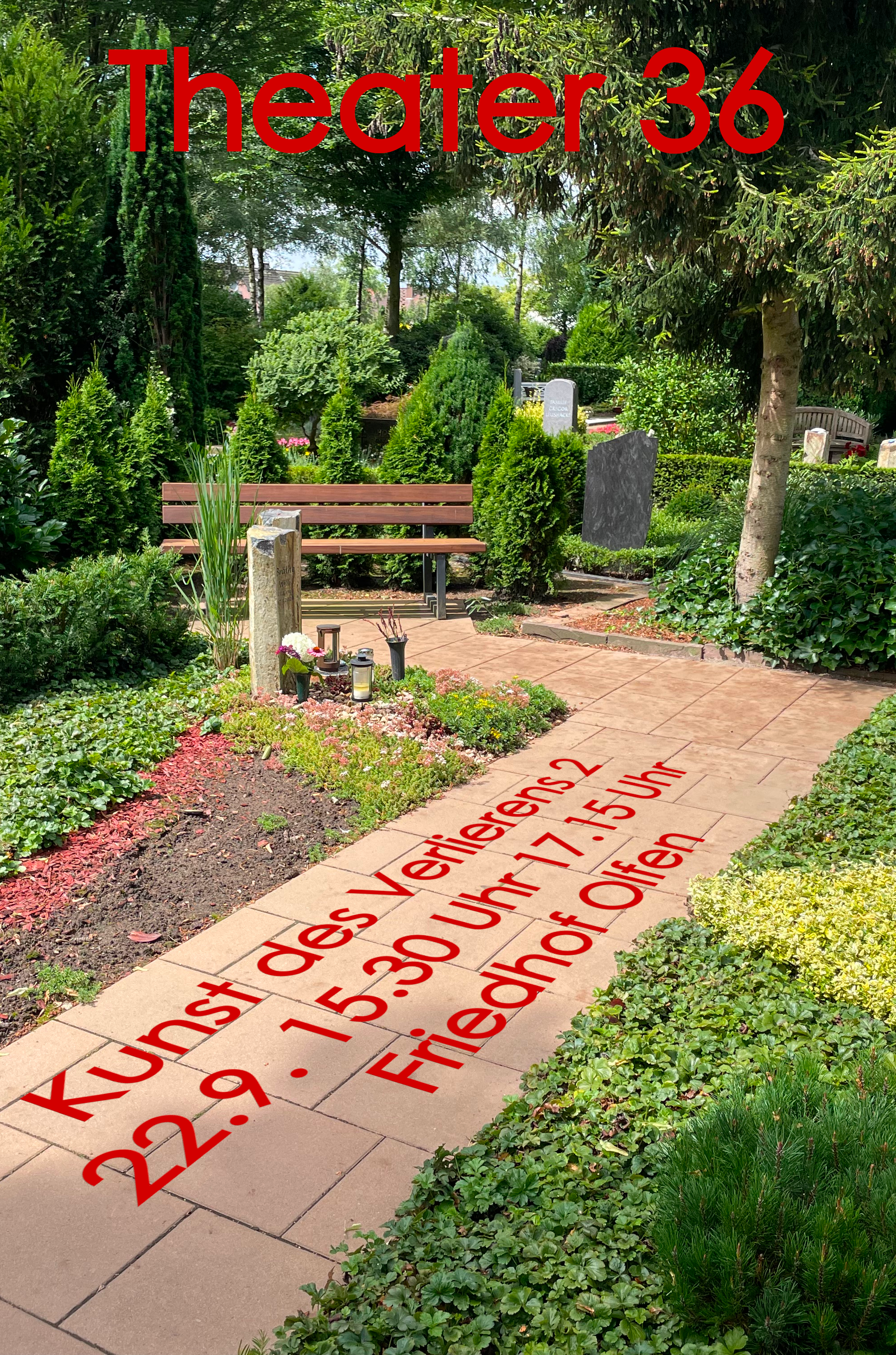 Das Theater36 spielt an verschiedenen Stationen auf dem Friedhof. Die Zuschauerinnen und Zuschauer werden von Ort zu Ort begleitet und lauschen Monologen über das Verlieren, Abschied nehmen und Loslassen, von Beckett bis Erich Kästner, mal tragisch, mal heiter, mal träumerisch